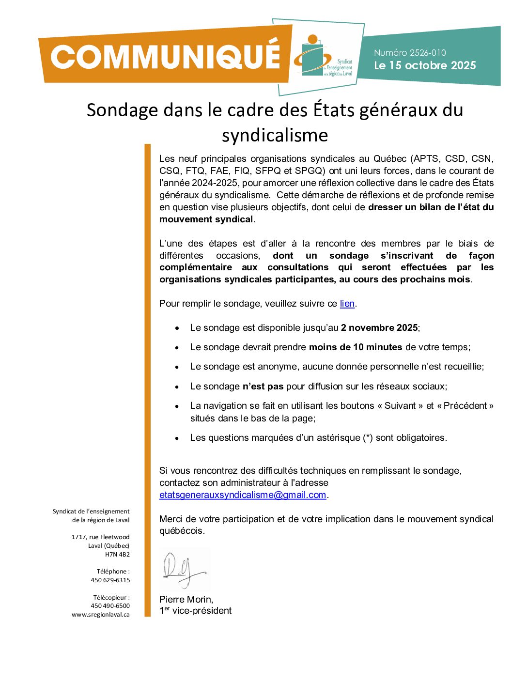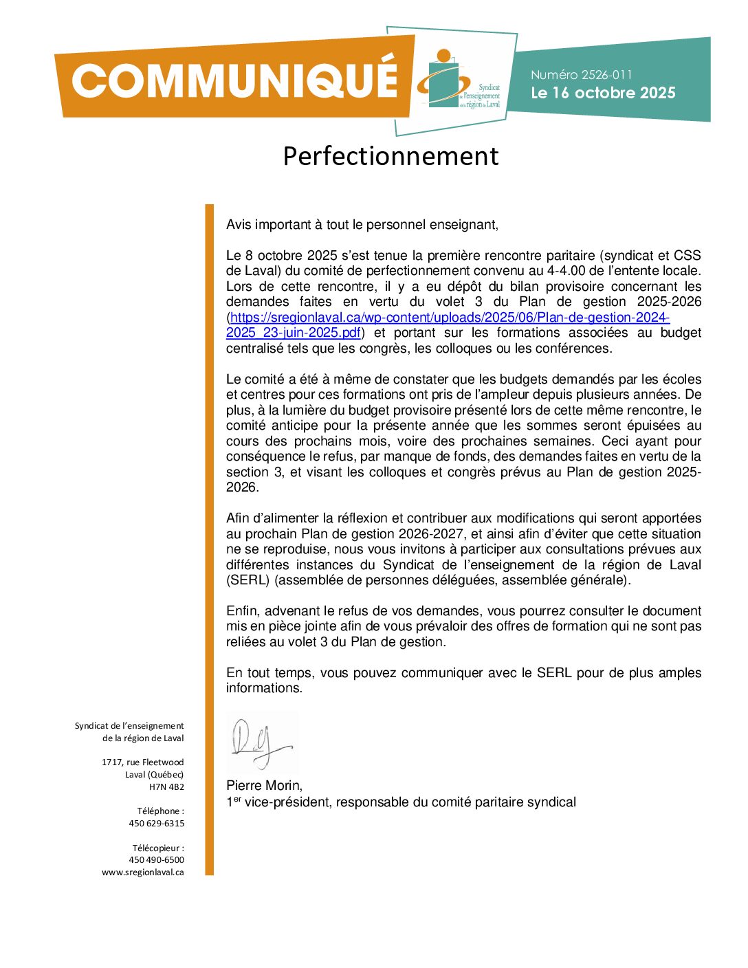 Avis important à tout le personnel enseignant, Le 8 octobre 2025 s’est tenue la première rencontre paritaire (syndicat et CSS de Laval) du comité de perfectionnement convenu au 4-4.00 de l’entente locale. Lors de cette rencontre, il y a eu dépôt du...