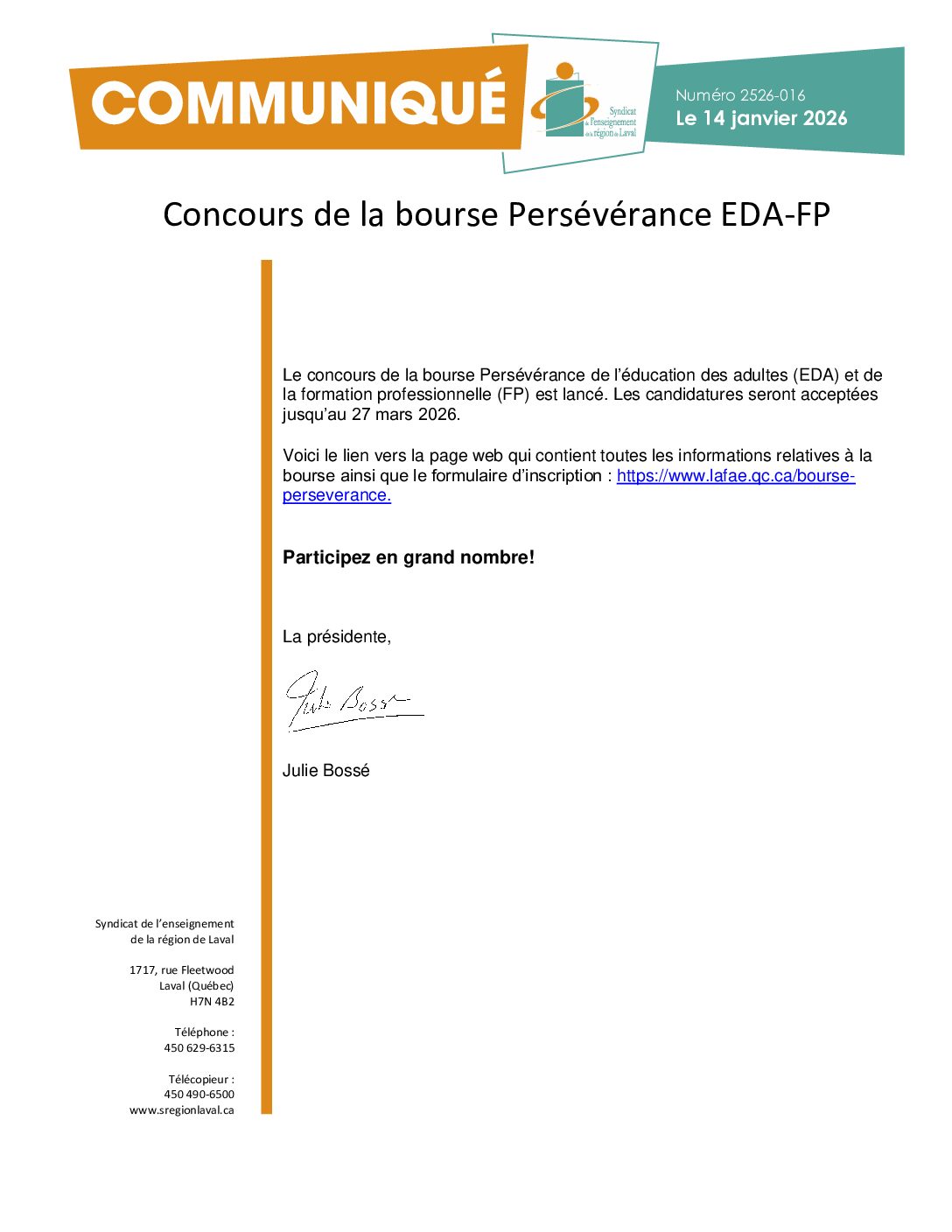 Le concours de la bourse Persévérance de l’éducation des adultes (EDA) et de la formation professionnelle (FP) est lancé. Les candidatures seront acceptées jusqu’au 27 mars 2026. Voir le communiqué officiel ICI.