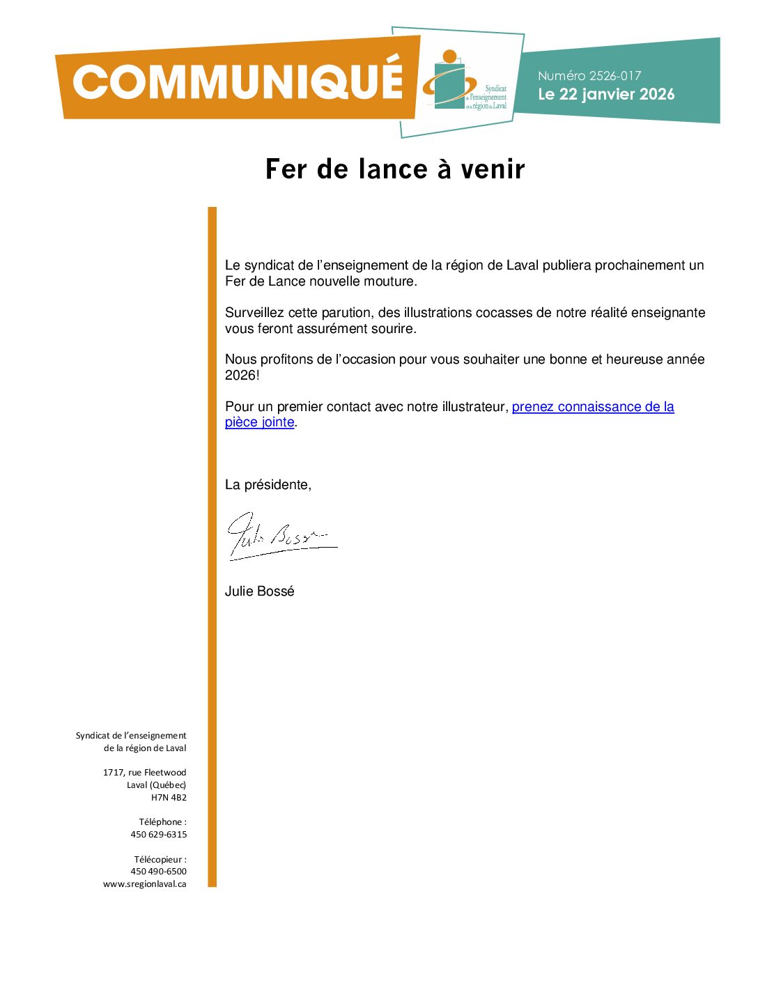 Le syndicat de l’enseignement de la région de Laval publiera prochainement un Fer de Lance nouvelle mouture. Surveillez cette parution, des illustrations cocasses de notre réalité enseignante vous feront assurément sourire. Voir le communiqué...