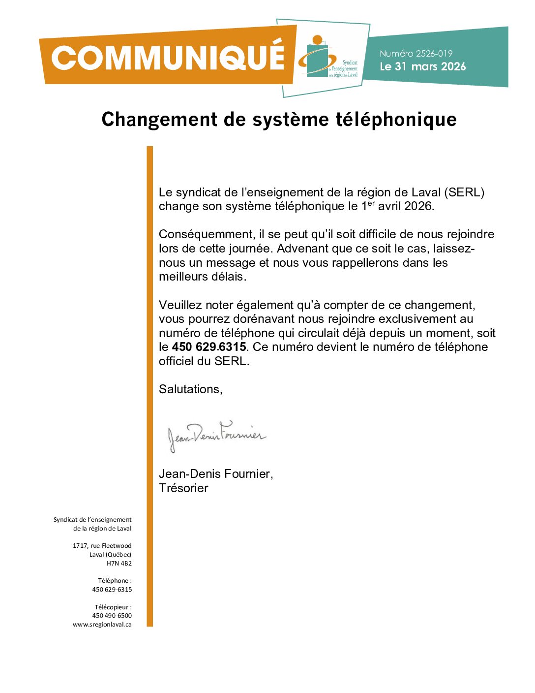 Le syndicat de l’enseignement de la région de Laval (SERL) change son système téléphonique le 1er avril 2026. Conséquemment, il se peut qu’il soit difficile de nous rejoindre lors de cette journée. Advenant que ce soit...
