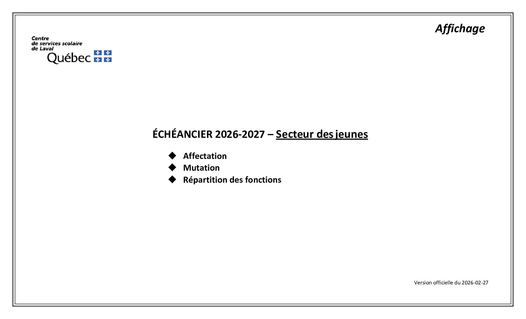 Vous trouverez en hyperlien ci-dessous les échéanciers 2026-2027 pour le secteur jeunes et pour le secteur de l'éducation des adultes et de la formation professionnelle. Échéancier 2026-2027 - Secteur jeunes Échéancier...