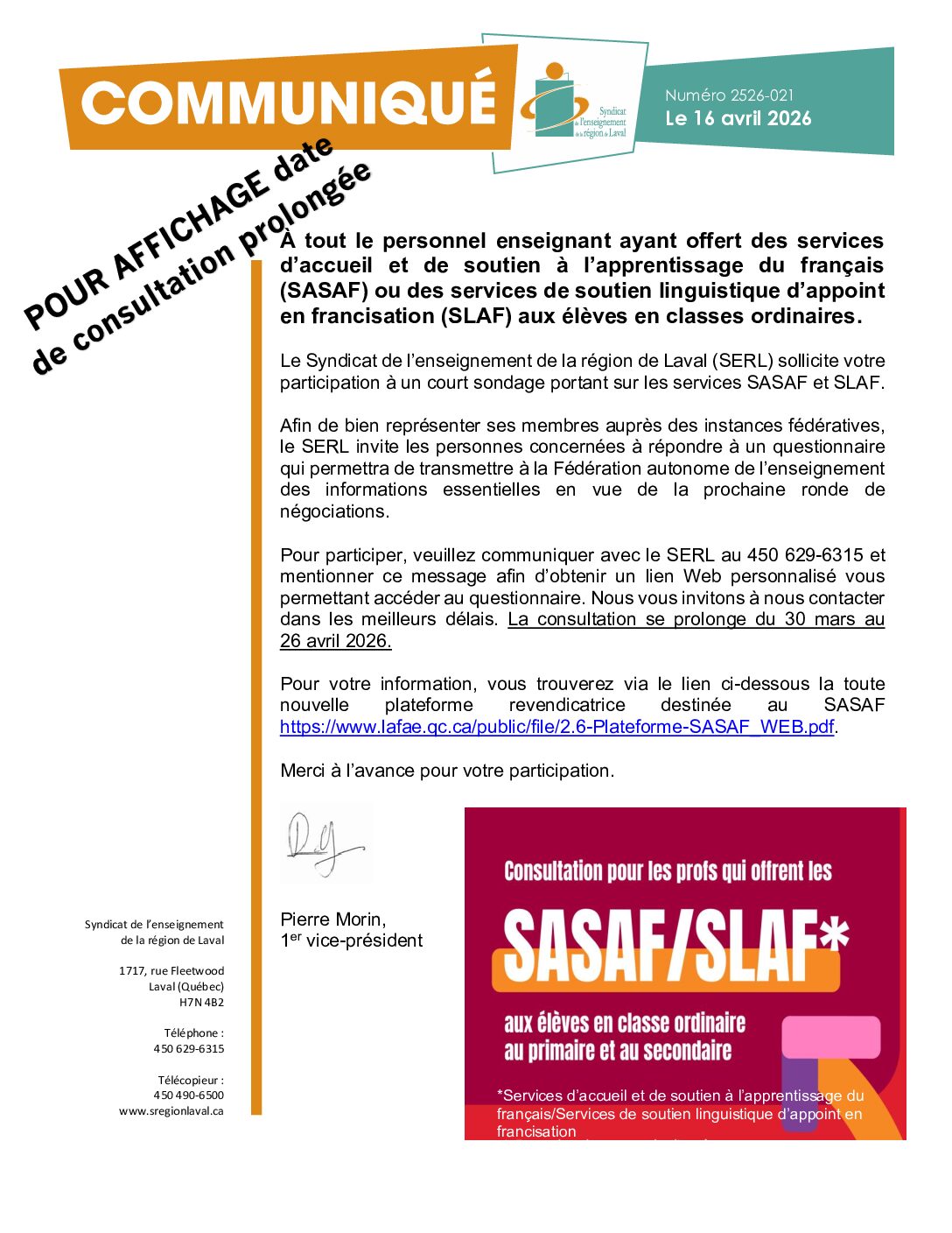 À tout le personnel enseignant ayant offert des services d’accueil et de soutien à l’apprentissage du français (SASAF) ou des services de soutien linguistique d’appoint en francisation (SLAF) aux élèves en classes ordinaires. Le Syndicat de...