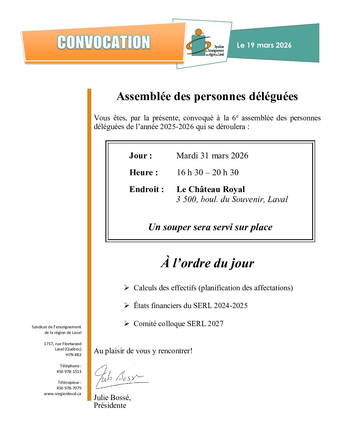 La 6e APD qui se déroulera le mardi 31 mars 2026 à 16 h 30 au CHÂTEAU ROYAL (3500, Boul. du Souvenir, Laval). Voir l'ordre du jour ICI.