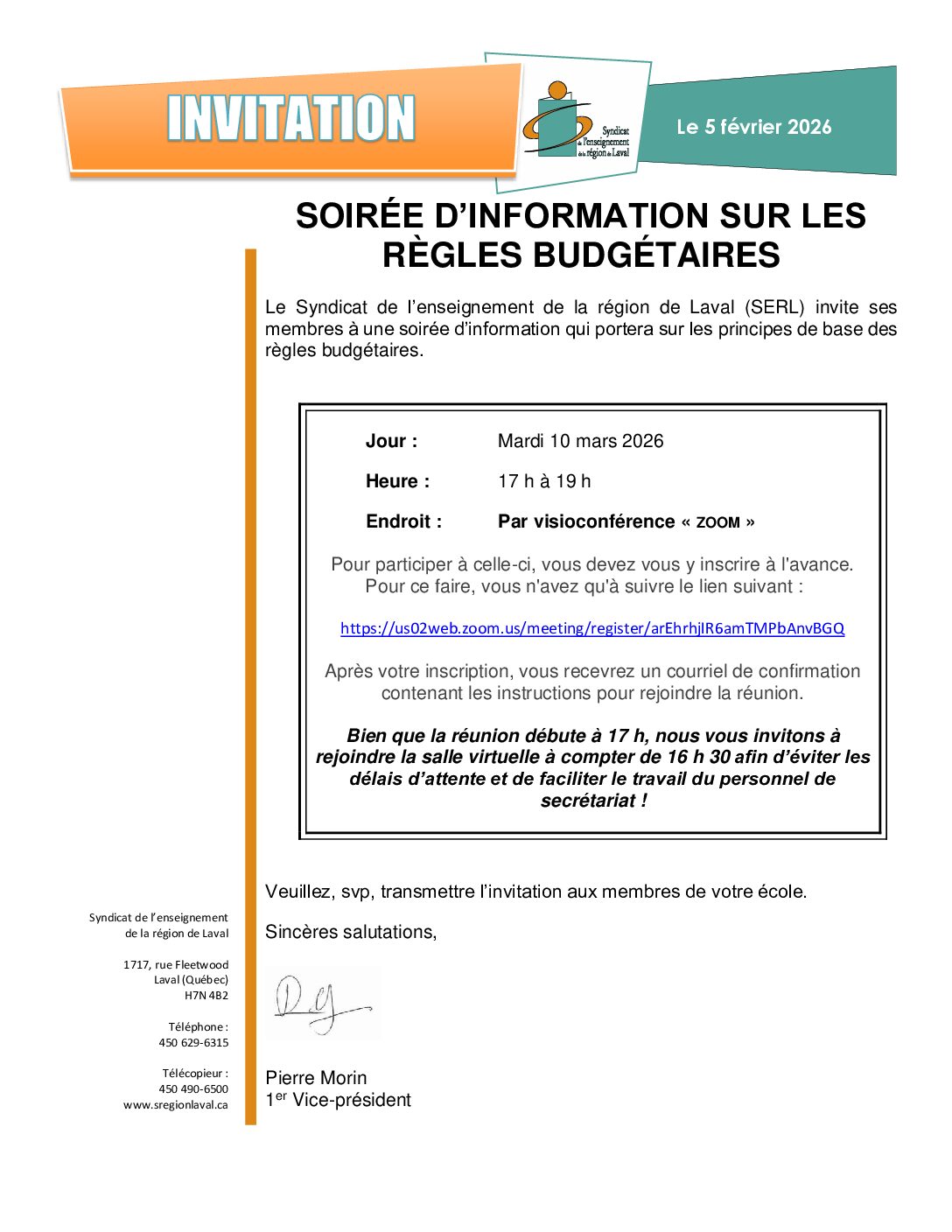 Le Syndicat de l’enseignement de la région de Laval (SERL) invite ses membres à une soirée d’information qui portera sur les principes de base des règles budgétaires. Voir l'invitation officielle ICI.