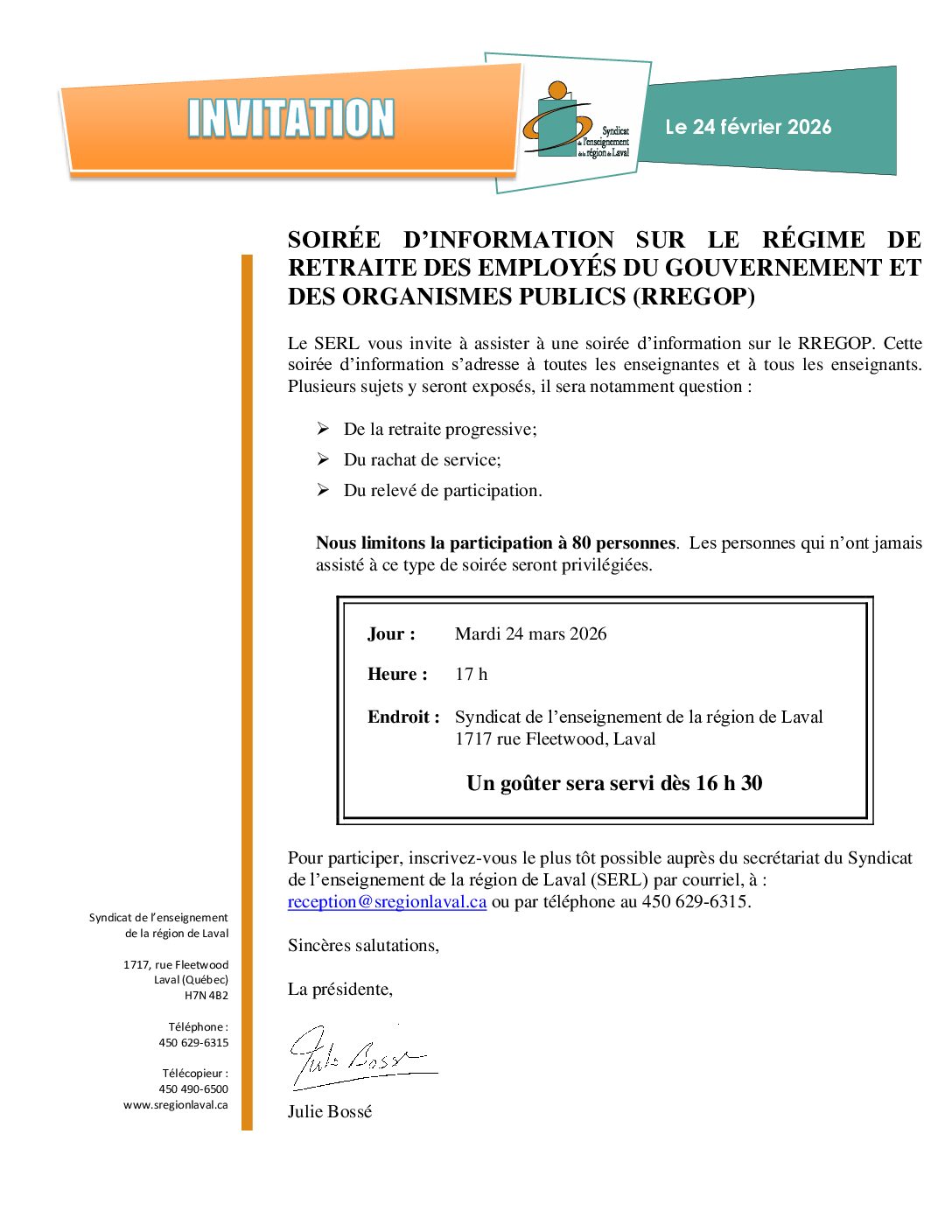 Le SERL vous invite à assister à une soirée d’information sur le RREGOP. Cette soirée d’information s’adresse à toutes les enseignantes et à tous les enseignants. Plusieurs sujets y seront exposés, (...) Voir l'invitation officielle ICI.