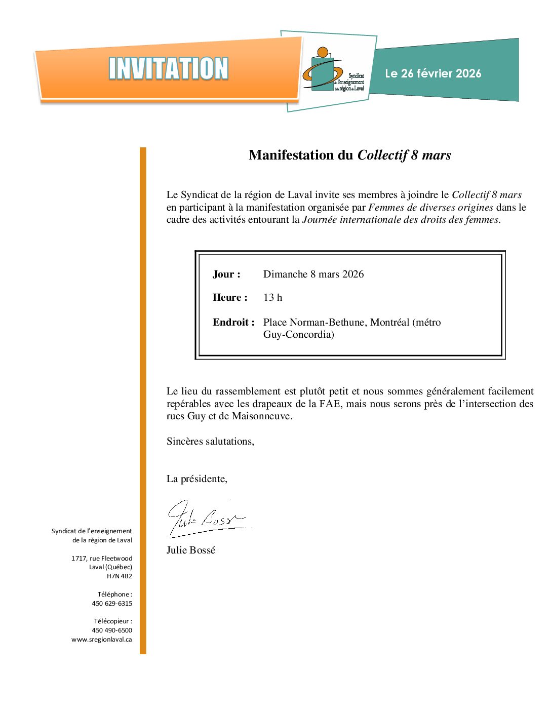 Le Syndicat de la région de Laval invite ses membres à joindre le Collectif 8 mars en participant à la manifestation organisée par Femmes de diverses origines dans le cadre des activités entourant la Journée internationale des droits des femmes. Voir l'invitation officielle ICI.