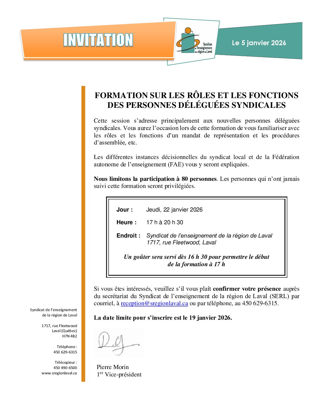 Syndicat de l'enseignement de la région de Laval 1717 rue Fleetwood,LavalCette session s’adresse principalement aux nouvelles personnes déléguées syndicales. Vous aurez l’occasion lors de cette formation de vous familiariser avec les rôles et les fonctions d’un mandat de représentation et les procédures d’assemblée, etc. Les différentes instances décisionnelles du syndicat local et de la Fédération autonome de l’enseignement (FAE) vous y seront expliquées. Voir l'invitation officielle ICI.